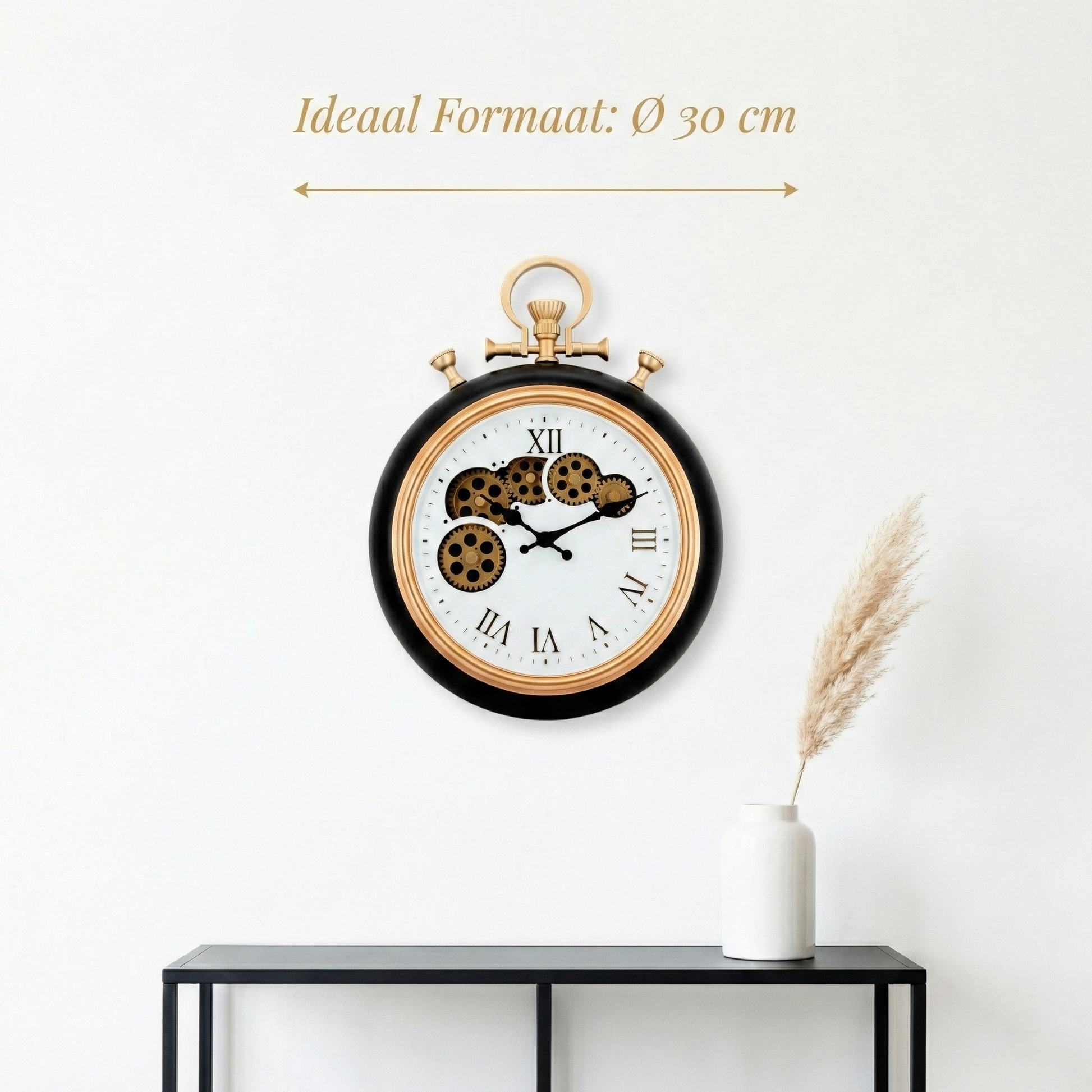 - Ideaal formaat: Met een diameter van 30 cm (en een totale hoogte van 40 cm inclusief de ring) is de klok groot genoeg om op te vallen, maar subtiel genoeg om niet de hele muur over te nemen.